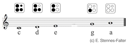 Wenn man die vier Grifflöcher mit der rechten Hand beginnend nacheinander aufdeckt, ergibt sich eine pentatonische Tonleiter.