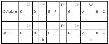 Bei den Geräten von D'Addario werden alle chromatischen Stufen mit # dargestellt.