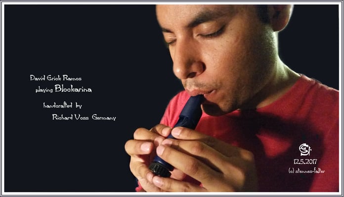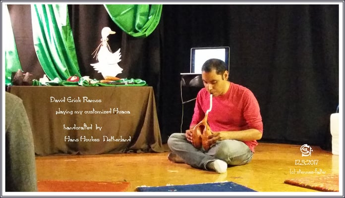Meine Huaca hat einen Anblasschlauch bekommen (Melodica-Zubehör), damit ich beim Spielen verschiedene Sitzhaltungen einnehmen kann. Dadurch konnte David sie im Schneidersitz spielen.