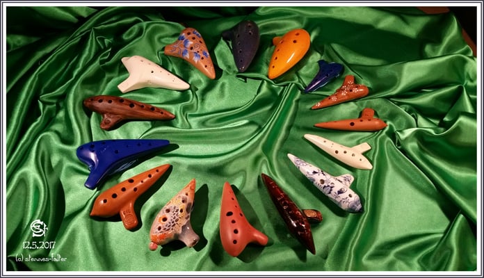 Das Thema "Materialien im Okarinabau" finde ich äußerst spannend. Neben den gezeigten Okarinas aus Kunststoff (Fokalink/Stein), Porzellan (Meissen) und Ton (der ganze Rest), gibt es auch Varianten aus Holz, Karton und Metall.