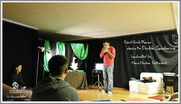 Die große Überraschung des Abends: Blockarina und Markerina von Richard Voss. David machte es großen Spaß, darauf zu spielen. Sie lagen ihm offensichtlich gut in der Hand und er lobte deren gute Stimmung. Auf den Fotos ist gut zu erkennen, dass die Löcher so positioniert sind, dass sie auch von großen Händen gut gegriffen werden können.