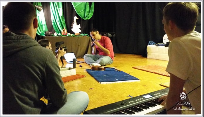 David hatte eine Präsentation vorbereitet. Seine Erläuterungen ergänzte er mit zahlreichen Musikeinlagen. Wo es passte, musizierten wir gemeinsam auf Okarinas oder begleiteten ihn mit Trommeln und Klein-Percussion. Keyboard und Dudelsack waren auch noch mit von der Partie. Wenn die Teilnehmer den Okarinapart übernehmen konnten, griff David zur Ukulele.