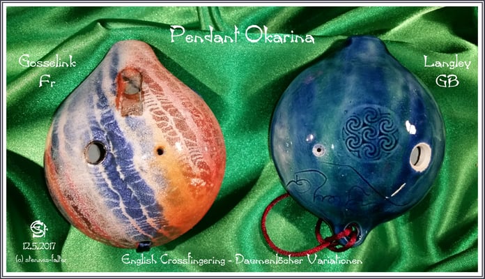 Die Pendant Okarina von Olivier Gosselink (Frankreich) wird ebenfalls mit dem English Crossfingering System gespielt. Allerdings befindet sich das kleine Daumenloch auf der rechten Seite. Das kleine Daumenloch ist für das Spielen der tiefsten Halbtöne hilfreich.