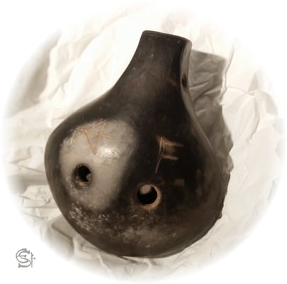 Dieses Foto zeigt eine auf der Töpferscheibe gedrehte Okarinas in tiefer Stimmlage.