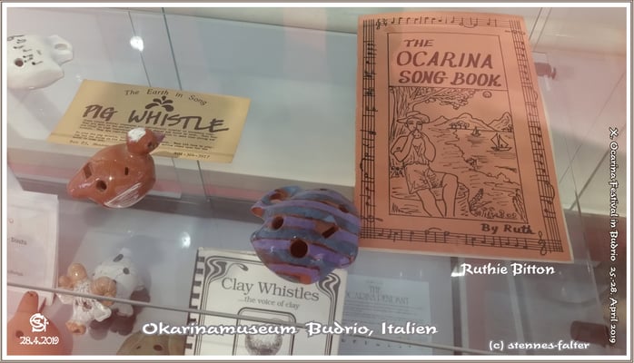 In einer anderen Vitrine entdeckte ich einen "Zwilling" meiner kürzlich aus zweiter Hand erworbenen Pendant-Okarina von Ruthie Bitton. Daneben weitere Instrumente derselben Machart nur anders dekoriert. Die mit dem English Crossfingering zu spielenden Instrumente weisen eine interessante Eigenheit auf: das Griffloch für den rechten Mittelfinger ist schlitzförmig. Diese raffinierte Idee ist mir bei noch keiner anderen Okarina begegnet. Der Vorteil der Schlitzform: Wenn das Griffloch sehr klein ist, erleichtert die Schlitzform das Spielen des Halbtons Cis enorm. Außerdem ist darauf die Sliding Technik anwendbar.