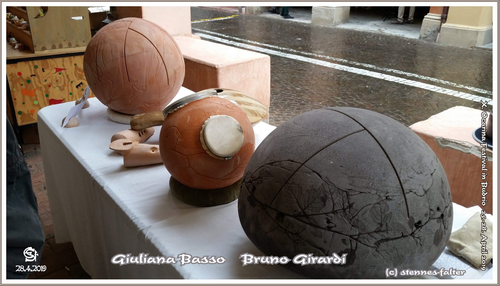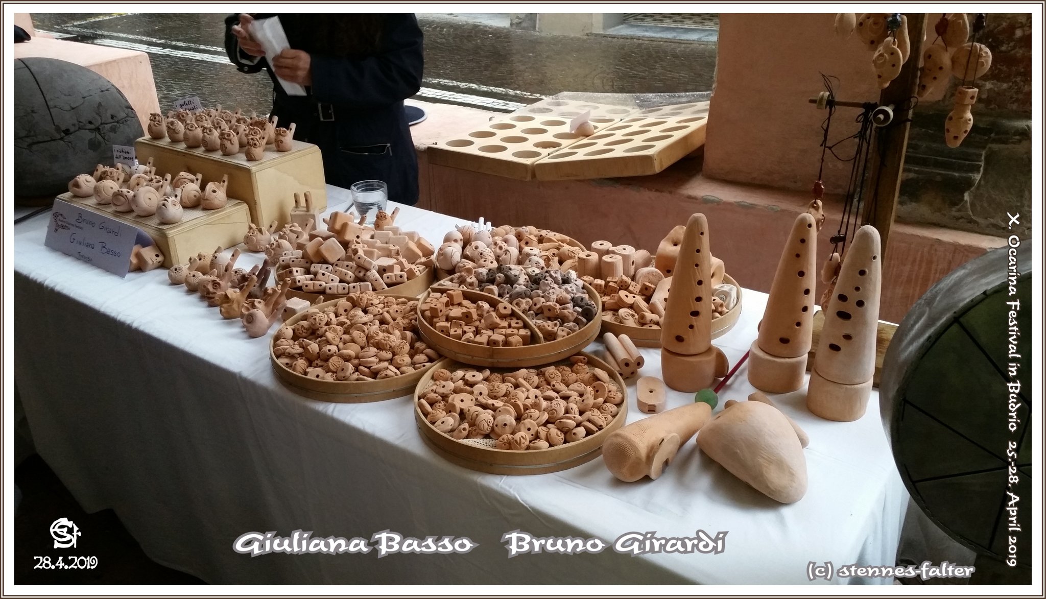 Bei Giuliana Basso und Bruno Girardi entdeckte ich eine Okarina, mit verschiebbarem Labium. Diese Vorrichtung ermöglicht es, die Okarina nachzustimmen. Die kegelförmigen Instrumente lassen sich dekorativ aufstellen. Das Mundstück ist in dreierlei Weise angebracht: