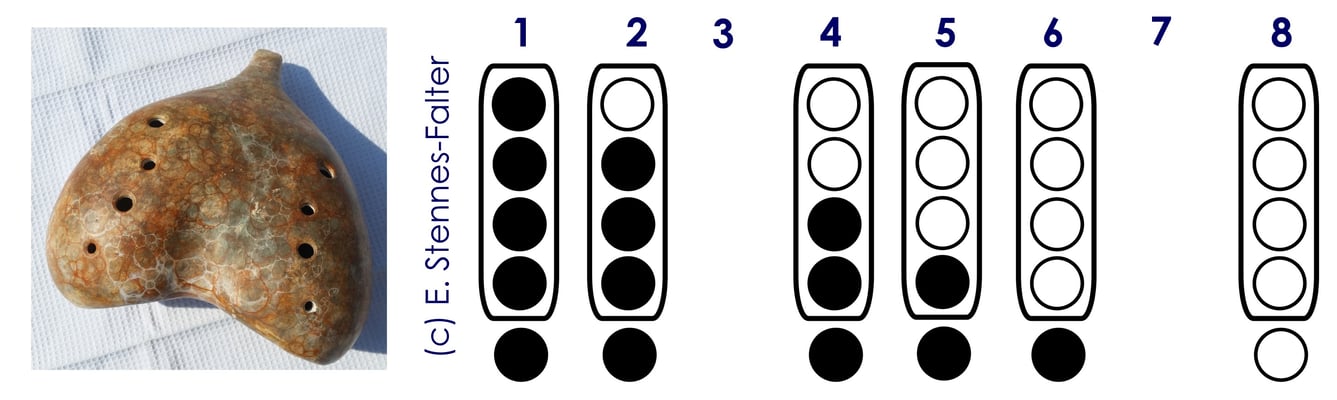 Bei Instrumenten mit 2 Kammern, um die es im Workshop vorrangig ging, werden die Griffsysteme mit 5 Fingern gespielt. Hans Houkes bietet dieses Jahr folgende drei Variationen des 5-Loch-Tunings