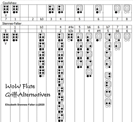 Vergleicht man die beiden folgenden Tabellen, sieht man, dass nicht nur der Griff für die 3, sondern auch der Griff für die 6 von mir einen Halbton tiefer in der Tonleiter eingeordnet wird, der Griff für die 7 sogar eine kleine Terz tiefer. Sollen diese Töne in der von Cowlishaw vorgesehenen Weise klingen, muss an diesen Stellen den Blasdruck erhöhen und anschließend wieder weg nehmen. Deshalb spielt sich die WoW-Flute mit dieser Grifftabelle nicht gut. Ein kleiner Trick hilft: