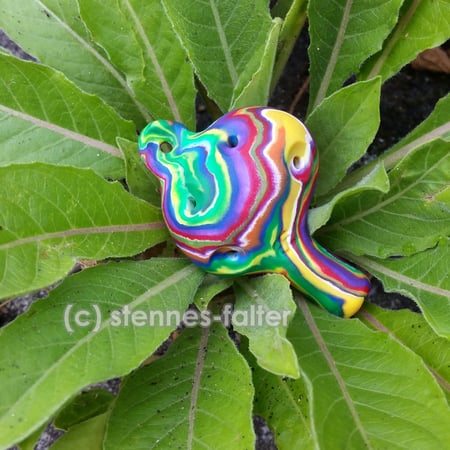Das große Daumenloch unterscheidet die Wowflute von der oben abgebildeten Peru-Okarina.