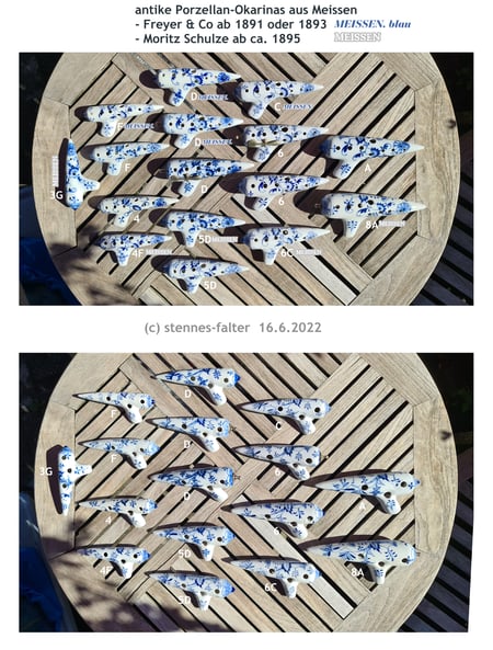 kann man sehen, warum meine MEISSEN-Okarina-Sammlung im Laufe der Jahre so umfangreich wurde. Die beiden Hersteller Freyer&Co und Moritz Schulze verwendeten systematische Bezeichnungssysteme,