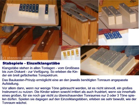 Einzelklangstäbe werden je nach Bedarf als Einzeltöne aufgestellt oder zu mehr oder weniger umfangreichen Tonleitern kombiniert. Sie sind in Metall, Palisander (Edelholz) und Palisono ("Kunstholz" mit sehr schönen Klangeigenschaften) erhältlich.