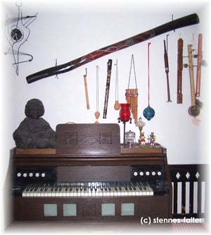 Im Musikraum hängt eine kleine Auswahl Blasinstrumente über dem Harmonium an der Wand. Besondere Aufmerksamkeit erweckt bei fast allen Besuchern das australische Digeridoo. "Kannst Du darauf spielen?" werde ich immer wieder gefragt. Naja, so richtig gut spielen nicht. Dafür fehlt mir die Übung. Was ich da an Klängen aus dem archaischen Instrument heraus locke, würde ich eher Experimente eines Anfängers bezeichnen. ;-)