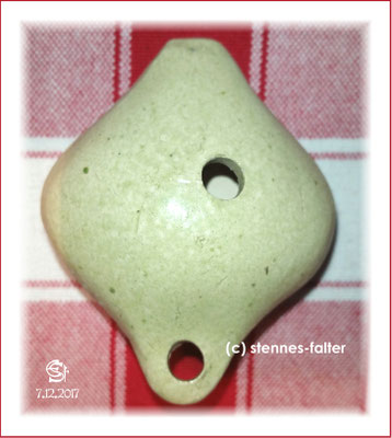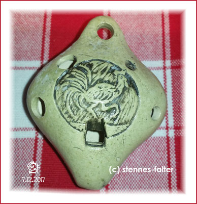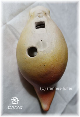 Der kleine Vogel stammt von Christoph Hense. (OcarinaStudio) Er setzt das einzelne Daumenloch seiner 5-Loch-Okarina auf die linke Seite. Da das Daumenloch des kleinen Vogels fast in der Mitte sitzt, greife ich es trotzdem vorzugsweise mit dem rechten Daumen, um nicht am oberen Ende der Tonleiter die auf den englischen Okarinas gelernte Griffolge umstellen zu müssen. Wer noch keine andere Okarina in der Hand hatte, dem wird das egal sein.