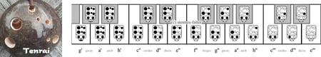 Tenrai bietet eine andere 8-Loch Variante an. Sie wird aber nur mit 6 Fingern gespielt und enthält 2 Subholes. Die Funktionieren zwar nach demselben Prinzip wie die Subholes von Travers-Okarinas werden aber in einer anderen Reihenfolge genutzt. Die Subholes erweitern den bis zur 10. Stufe reichenden Tonraum bis zur Terz unter den Grundton. In Summe ist das eine große Duodezime. Mit der Tenrai kommt man also ganz ohne Tricksen auf insgesamt 20 Töne. Aber da geht noch mehr. Da das Fenster der Okarina auf der Kinnseite in einer tiefen Mulde liegt, lässt sich der Tonraum mit dem Fipple-Bending zusätzlich nach unten erweitern. Dieses Fipple-Bending gehört zum Intonations-Konzept der Okarina. Deshalb enthalten die Griffsymbole ein Zeichen für das Fenster, also den Aufschnitt der Okarina (engl. "fipple"). Ein leichtes Abschatten des Fensters ergibt eine Absenkung um einen Halbton. Mit einer stärkeren Abschattung kommt man problemlos einen Ganzton nach unten, also bis zum G. So kann man insgesamt 22 Töne auf der Tenrai 8Loch Pendant spielen.