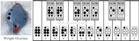 Mit Hilfe einer Erweiterung des English Crossfingering, wird ein chromatischer Tonraum mit der Reichweite einer Duodezime spielbar. Auf der diatonischen Stammtonleiter sind das 12 Stufen. Inclusive aller chromatischen Stufen stehen auf dieser Okarina von Kevin Wright gebauten Okarina 19 Tone zur Verfügung! Der tiefste Ton liegt unter dem Grundton. Er wird mit dem rechten Ringfinger auf einem Subhole gespielt. Durch Absenken des Blasdrucks kommt man noch einen weiteren Halbton nach unten. So kommt man auf insgesamt 20 Töne.