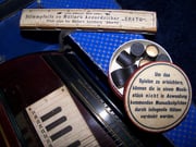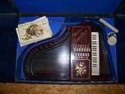 Mein gewichtiges Schätzchen ist eine "Müller's Erato-Harfe". Der Vorbesitzer überließ mit dem Instrument eine mehrtönige Stimmpfeife, Notenhefte und eine Dose mit Kappen, die man über die nicht benötigten Manual-Knöpfe steckt, um sich die Orientierung auf dem Instrument zu erleichtern. Instrument und Koffer waren ziemlich verschmutzt. Doch mit viel Geduld wurde wieder ein ansehnliches Schmuckstück daraus. Irgendwann sollen mal die fehlenden Saiten ersetzt werden, damit das gute Stück wieder voll bespielbar ist.