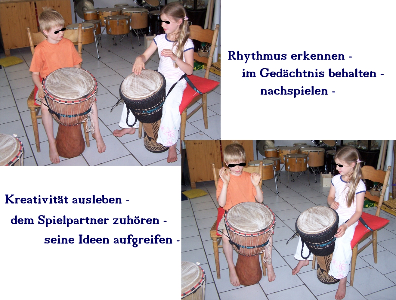 Je fortgeschrittener die Gruppe, um so vielschichtiger die Gestaltung des Ensemblespiels, das mit den Partnerinstrumenten der Dembé, Basstrommeln und Glocken, bereichert wird.